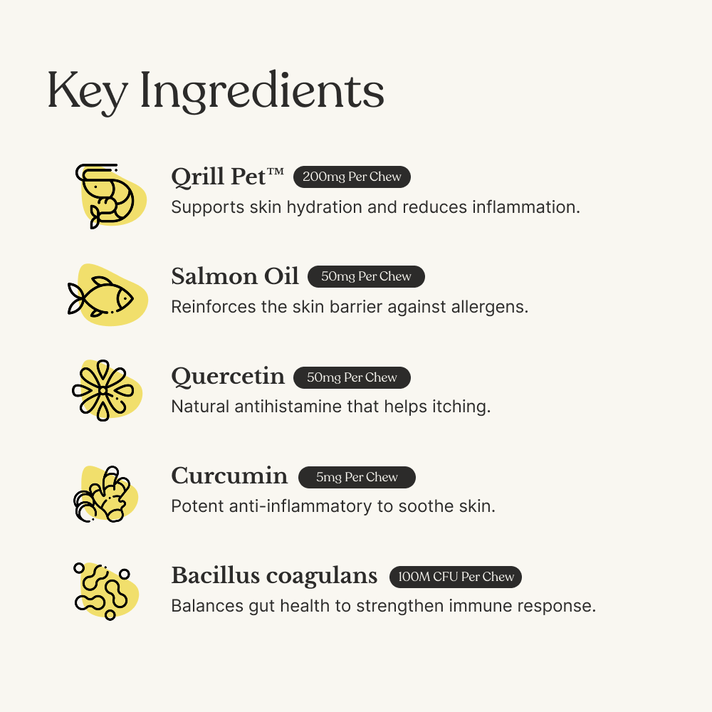 Every ingredient in our allergy chews is selected for a reason— No fluff, no unnecessary fillers— Because precision matters when it comes to relief.